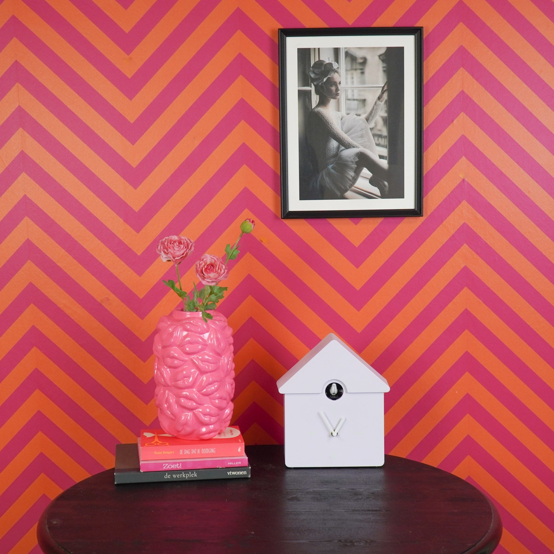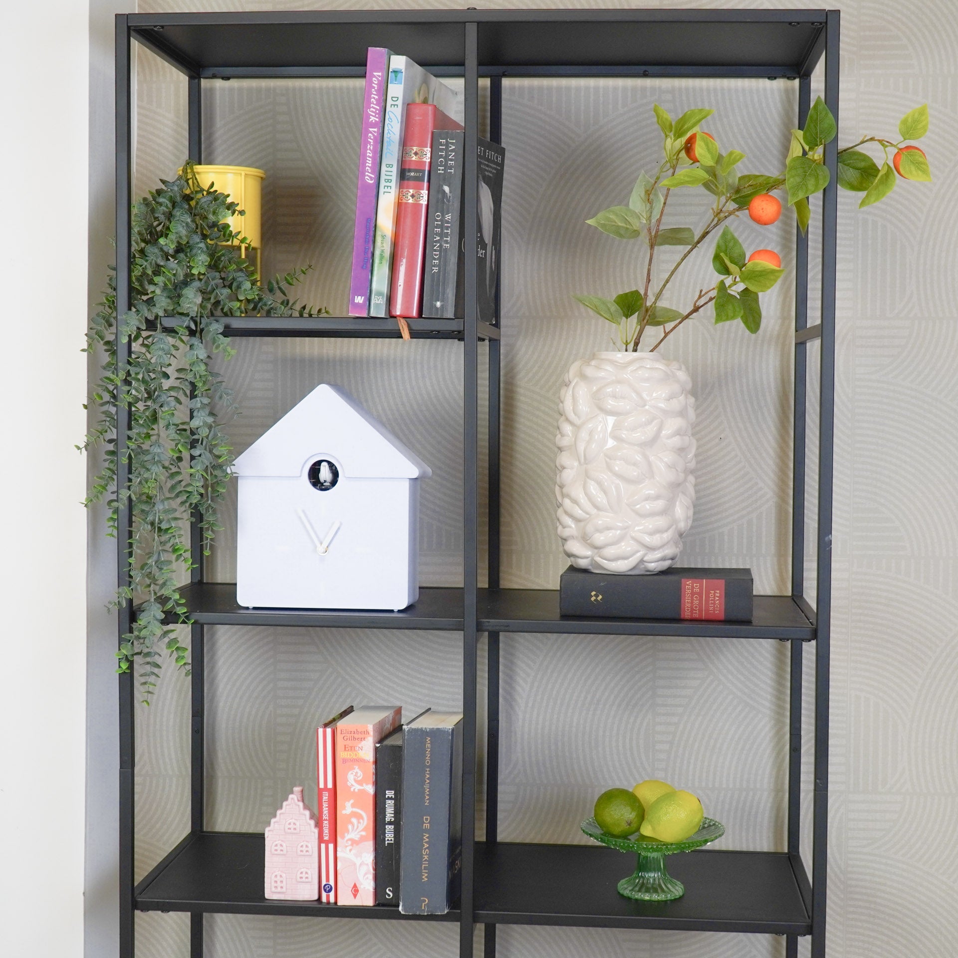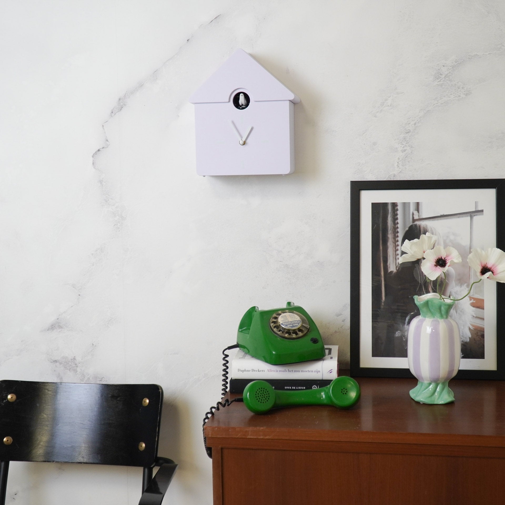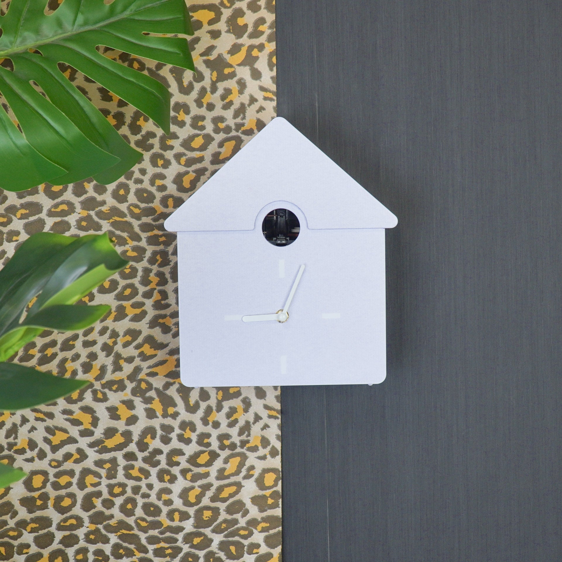 Styling tip: De gekleurde moderne koekoeksklok spat er helemaal van af als je hem voor een rustige achtergrond hangt of neerzet.