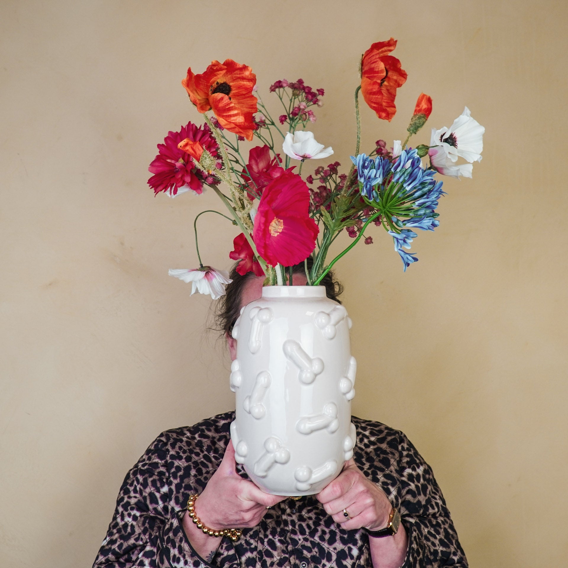 Styling tip: Geef hem een mooie plek ergens in huis, dat verdient deze mooie bloemen vaas met piemels.